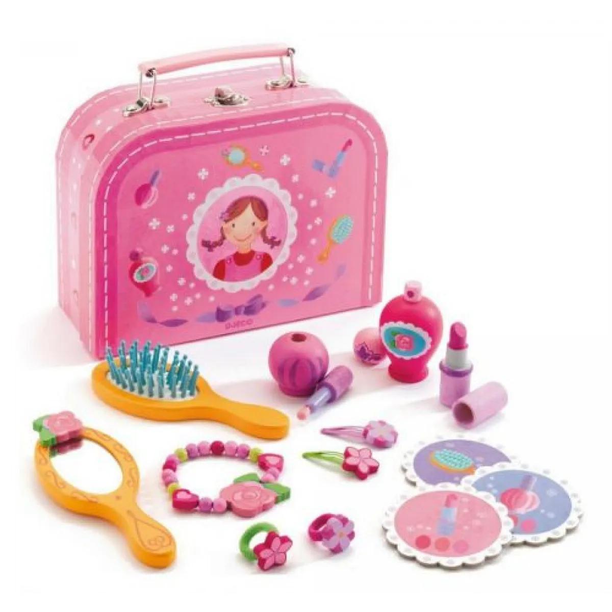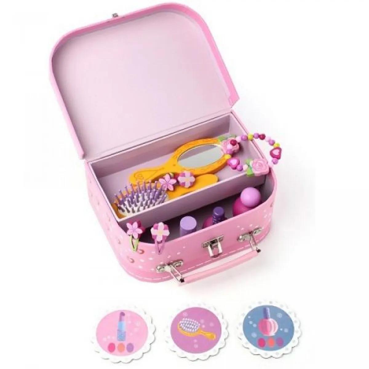 Igračka malo koferče za ulepšavanje atraktivnog dizajna. Koferče sadrži sve što vam je potrebno da napravite frizuru i šminku. Sadržaj: 1 kartonski koferčić sa ručkom koja sadrži 4 karte i niz drvenih dodataka: 1 narukvica, 2 kuglice za kosu, 2 kopče za kosu, 1 četka, 1 ogledalo, 1 parfem, 1 lak za nokte i 1 ruž za usne. Kozmetički proizvodi su samo imitacija od drveta. Dimenzije 20 x 14,5 x 8cm.