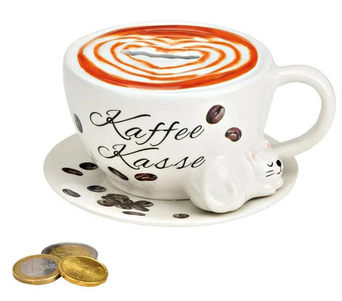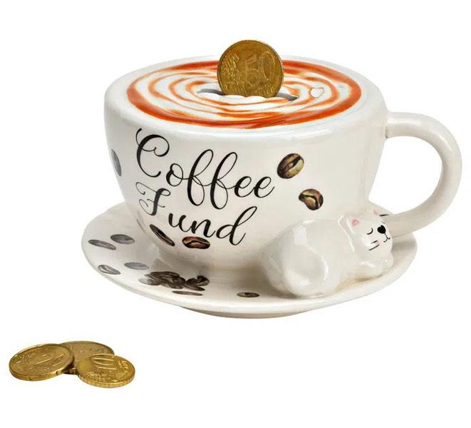 Keramička kasica, šolja kafe sa zaspalom macom na tacnici; sa donje strane tacnice je čep; dimenzije: 14x8x13cm
