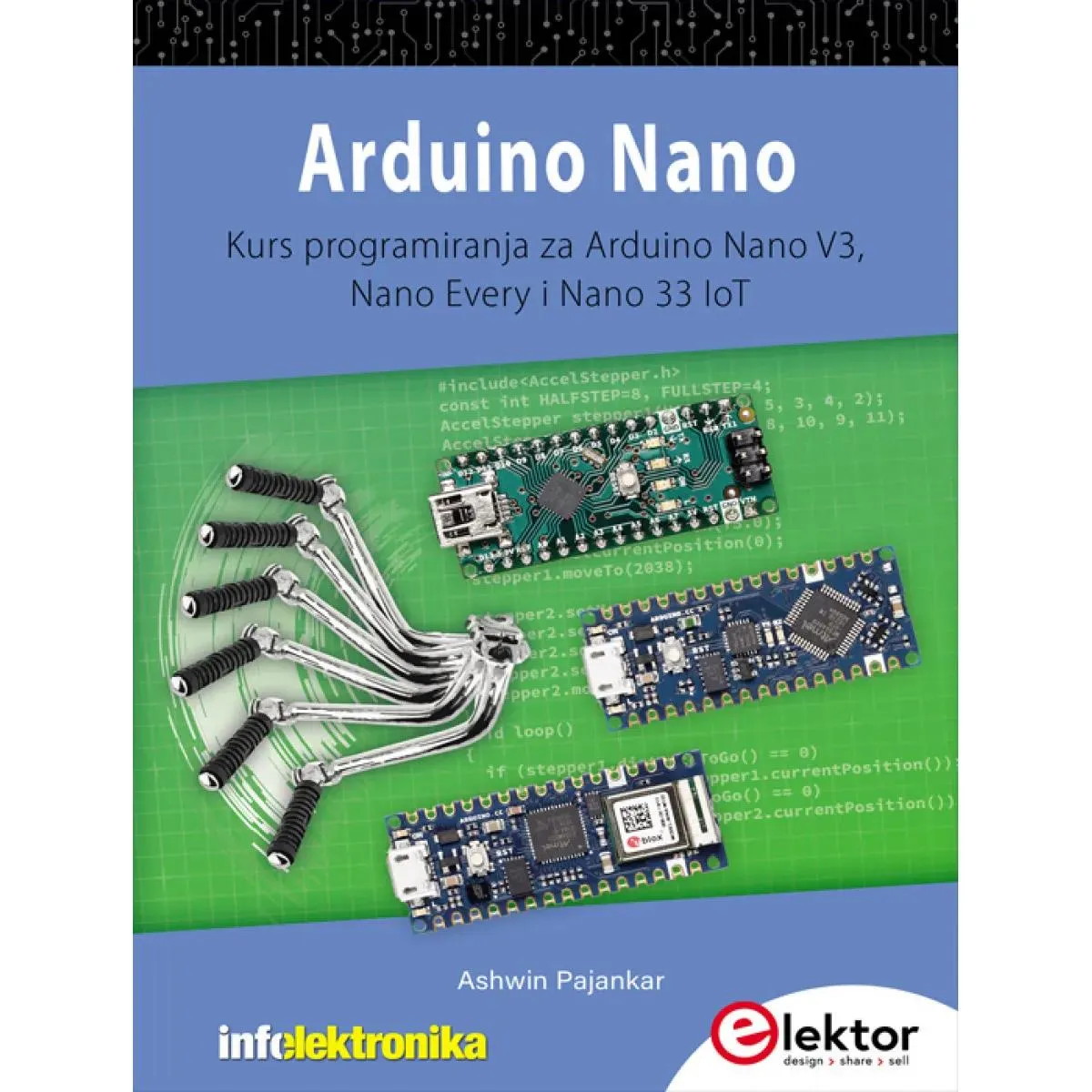 Sedam poglavlja u ovoj knjizi služe kao prvi korak za početnike i ljubitelje mikrokontrolera koji žele da steknu prednost u Arduino programiranju. U prvom poglavlju su predstavljeni Arduino platforma, ekosistem i postojeće varijante Arduino Nano ploča. Takođe ćete naučiti kako da instalirate različite alatke potrebne za početak Arduino programiranja. Drugo poglavlje počinje izradom elektronskih kola i programiranjem na vašem Arduinu. U trećem poglavlju istražujemo različite magistrale (buses) i analogne ulaze. U četvrtom poglavlju upoznaćete koncept modulisanja širine impulsa (PWM - Pulse width modulation) i rad u jednopolarnim koračnim motorima.