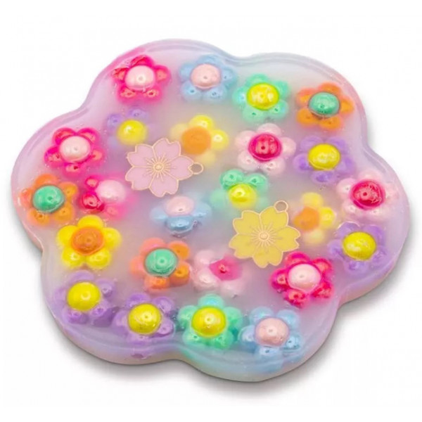 Kreativni set za pravljenje narukvica sadrži silikonski jastučić u obliku cveta pun raznobojnih cvetnih perlica i privezaka koji se izbacuju pritiskanjem tog jastučića i istiskivanjem perlica, te ovaj set pored kreativnosti podstiče i senzornu stimulaciju. Set sadrži dovoljno materijala za pravljenje dve jedinstvene narukvice.