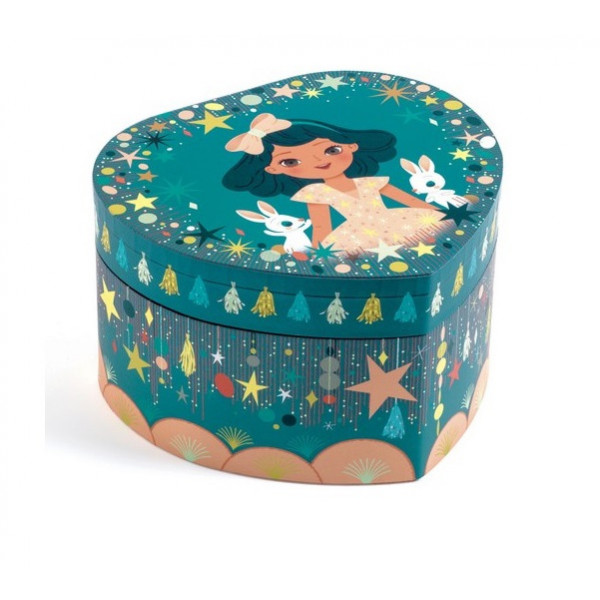 Happy party je lepo ilustrovana muzička kutija u obliku srca za čuvanje vašeg nakita i tajni. Okrenite ručicu, otvorite kutiju i iznenađenje! Mala plesačica se okreće i baca svoj odraz u ogledalo na zvuk "Priče iz bečke šume" Johanna Straussa. Dimenzije 14,8 x 15 x 9 cm