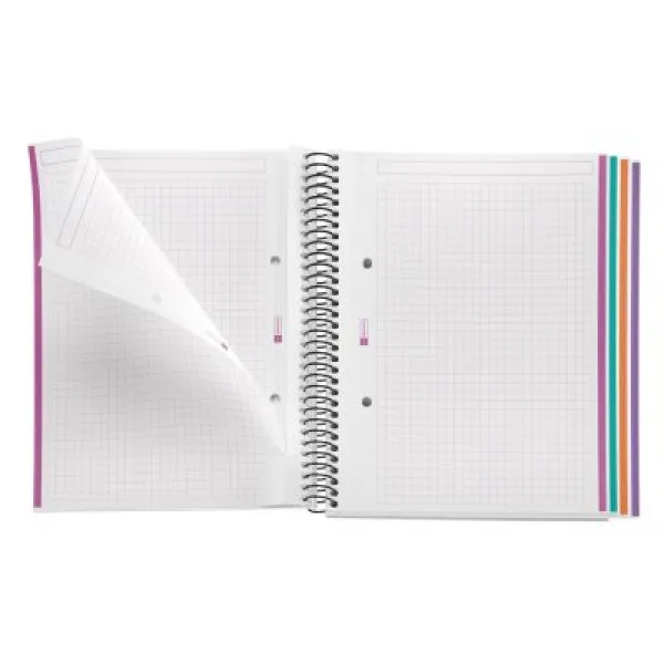 Sveska A5 formata sa spiralnim tvrdim povezom. Sadrži 100 listova na kvadratiće koji imaju perforaciju za lako odvajanje stranica. Tip papira: reciklirani 70 g.