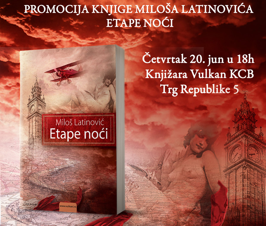Pozivamo sve ljubitelje savremene književnosti na promociju novog romana Miloša Latinovića pod nazivom Etape noći. Promocija će biti održana u četvrtak, 20. juna, u knjižari Vulkan KCB (Trg republike 5), sa početkom u 18 sati. Pored autora, o knjizi će govoriti Željko Jovanović, Umetnički direktor Pozorišta na Terazijama i Marija Radić, urednica Vulkan izdavaštva.