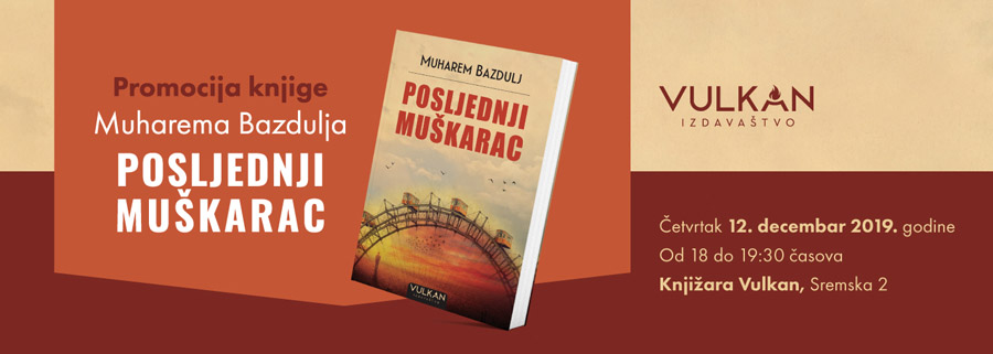 Pozivamo vas na promociju i potpisivanje novog romana Posljednji muškarac Muharema Bazdulja koja će biti organizovana u četvrtak, 12. decembra u knjižari Vulkan u Sremskoj 2 sa početkom od 18 sati. Tom prilikom, pored autora, prisutnima će se obratiti književni prevodilac, pesnik i esejista Vladimir Janković, filmski i knjževni kritičar Miroljub Stojanović i urednica Vulkan izdavaštva Marija Radić.