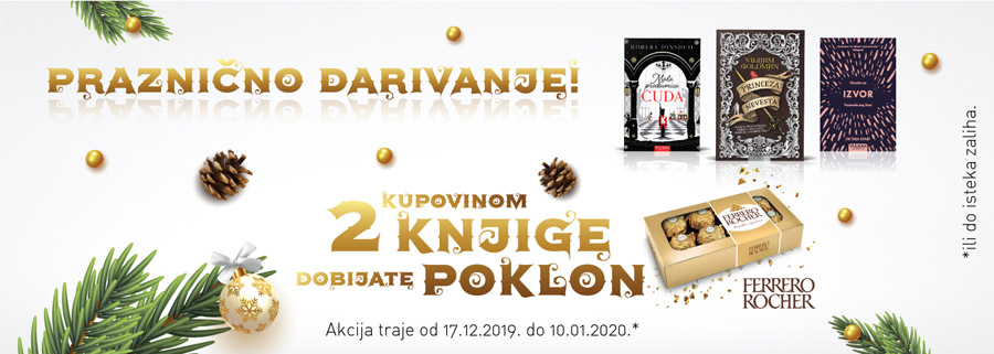 Praznici su vreme darivanja, a Vulkan izdavaštvo pripremilo je najlepše poklone za vas i vaše najdraže! Kupovinom dve knjige od tri odabrana praznična naslova, samo u knjižarama Vulkan i sajtu, na poklon dobijate i slatko iznenađenje Ferrero Rocher. Velika praznična akcija traje od 17. decembra 2019. godine do 10. januara 2020. godine.