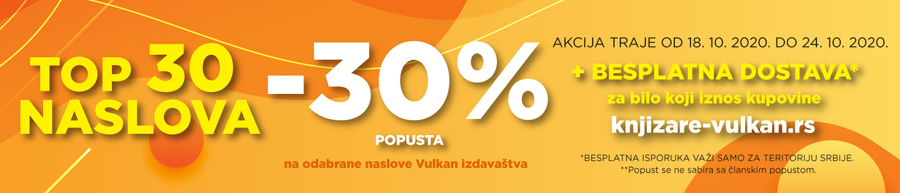 Top 30 Vulkanovih naslova je na popustu od 30% + dodatnih 10% popusta na 3 kupljene knjige u vreme trajanja Vulkanovog sajma knjiga od 18.do 24. oktobra 2020. godine.