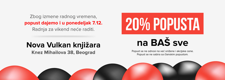 Zbog izmena u radu naših knjižara, popust od 20% na celokupan asortiman*, produžili smo i na ponedeljak 7. decembar.