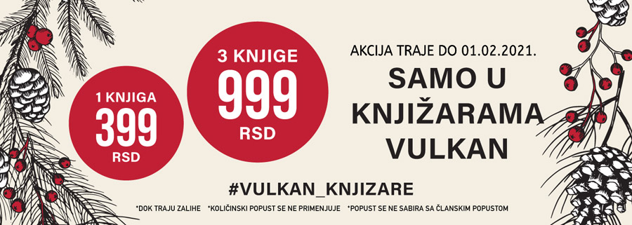 U periodu od 15. decembra 2020. do 01. februara 2021. godine možete kupiti odabrane naslove u izdanju Vulkan izdavaštva po ceni od 399 dinara za jednu knjigu ili tri knjige za 999 dinara.