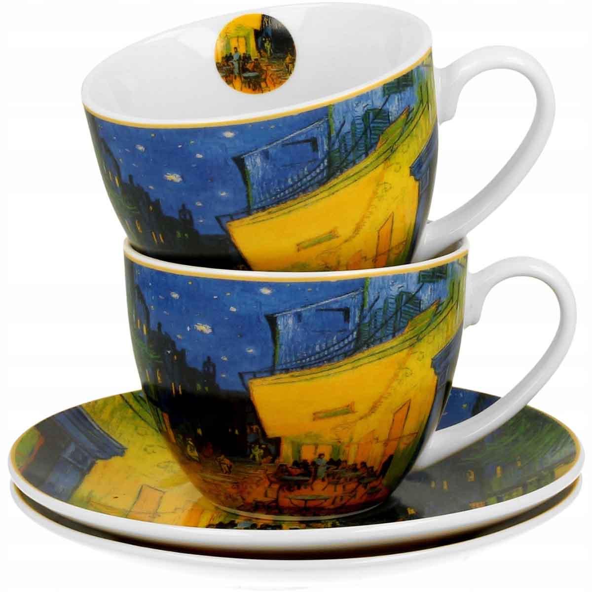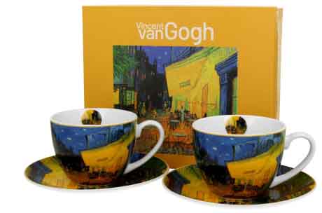 Set od dve šolje za kafu ili čaj i dva tanjirića od finog porcelana, sa motivima slike "Terasa kafane u noći" poznatog slikara Vinsenta van Goga. Šolje i tanjirići se mogu koristiti u mikrotalasnoj pećnici i prati u mašini za pranje sudova.